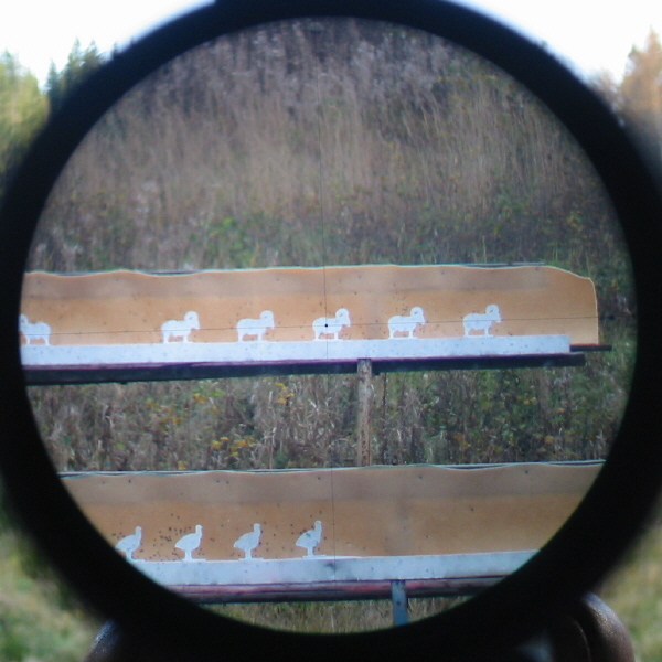Neljä sarjaa kanasiluetteja ampujalle 1 (vasemmalla) ja ampujalle 2 (oikealla) 80 laukauksen kilpailussa. Kuvasarjat ammutaan seuraavassa järjestyksessä: vasen-ala, vasen-ylä, oikea-ala, oikea-ylä. Sika-, kalkkuna- ja pässisiluetit taustalla.